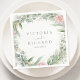 Beautiful wedding napkins featuring pink floral watercolor eucalyptus and gold leaves.