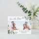 Stylish and whimsical vertical card to thank your guests for being a part of your wedding day. This customisable thank you postcard features white modern calligraphy overlay. This design is also available in other cards.