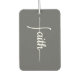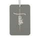 This car air freshener offers a graceful expression of faith, blending simplicity with meaning. The word “Faith” appears in elegant script text, arranged vertically against a deep gray background. The vertical design forms the subtle outline of a cross, creating a striking yet understated symbol of spirituality. Thoughtfully crafted, it serves as a daily reminder of strength, devotion, and inspiration wherever the road takes you.