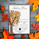 This elegant fall wedding invitation is perfect for a modern autumn wedding. The simple design features a tree and fall leaves with elegant black and brown typography on a white background.