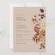 This elegant and modern bridal shower invitation features hand-painted watercolor burnt orange and terracotta leaves, cream and beige dahlias, and beautiful rust-coloured roses on a taupe background with brown text. Find matching items in the Taupe Autumn Romance Collection.