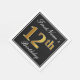 This simple and elegant paper napkin design features a message like "FirstName’s 12th Birthday" (with the "12th" having a faux gold-like colouring) within a black-coloured square area featuring a simple border outline. The name is in a white-coloured script-like text, and can be personalised. Napkins like these could perhaps be used at a birthday party for somebody who is celebrating their twelfth birthday. [~Z0000136]