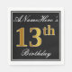 This simple and elegant paper napkin design features a message like "ANameHere’s 13th Birthday" (with the "13th" having a faux gold-like colouring) within a black-coloured square area featuring a simple border outline. The name is in a white-coloured script-like text, and can be personalised. Napkins like these could perhaps be used at a birthday party for somebody who is celebrating their thirteenth birthday. [~Z0000136]