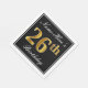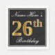 This simple and elegant paper napkin design features a message like "Name-Here’s 26th Birthday" (with the "26th" having a faux gold-like colouring look) within a black-coloured square area featuring a simple border outline. The name is in a white-coloured script-like text, and can be personalised. Napkins like these could perhaps be used at a birthday party for somebody who is celebrating their twenty sixth birthday. [~Z0000136]