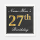 This simple and elegant paper napkin design features a message like "Name-Here’s 27th Birthday" (with the "27th" having a faux gold-like colouring look) within a black-coloured square area featuring a simple border outline. The name is in a white-coloured script-like text, and can be customised. Napkins like these could perhaps be used at a birthday party for somebody who is celebrating their twenty seventh birthday. [~Z0000136]