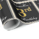 This simple and elegant wrapping paper design features a personalised message like "NameHere’s 3rd Birthday" (with the "3rd" having a faux/imitation gold-like colouring look) within a black-coloured square area featuring a simple border outline. The name is in an elegant white-coloured script-like text, and can be customised. Wrapping paper like this could perhaps be used when wrapping birthday gifts for somebody who is celebrating their third birthday. [~Z0000217]