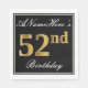 This simple and elegant paper napkin design features a message like "ANameHere’s 52nd Birthday" (with the "52nd" having a faux gold-like colouring look) within a black-coloured square area featuring a simple border outline. The name is in a white-coloured script-like text, and can be personalised. Napkins like these could perhaps be used at a birthday party for somebody who is celebrating their fifty second birthday. [~Z0000136]