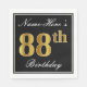This simple and elegant paper napkin design features a message like "Name-Here’s 88th Birthday" (with the "88th" having a faux gold-like colouring) within a black-coloured square area featuring a simple border outline. The name is in a white-coloured script-like text, and can be personalised. Napkins like these could perhaps be used at a birthday party for somebody who is celebrating their eighty eighth birthday. [~Z0000136]