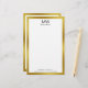 A large black monogram is at the top. A line of black display text is under the monogram for the name. Two lines of black display text are at the bottom. You can edit that text to show contact information such as a phone number, email address, and street address. All text can be edited or deleted. This professional stationery has a faux gold border. (The border is not made of foil.)
