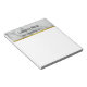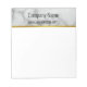 At the top, there's a faux grey marble stripe that has black display text you can replace with your company name, website, or a custom message. A thin faux gold stripe is under the marble stripe. The rest of the notepad is a white writing area. The gold look is artwork (not foil).