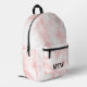 This backpack has an elegant faux pink marble pattern. Three black letters are on the pocket. You can change the initials to show the correct monogram.
