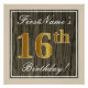 This simple and elegant birthday party poster design features a personalised message like "FirstName’s 16th Birthday!" (with the "16th" having a faux/imitation gold-like colouring look) within a rustic faux/imitation wood appearance square area featuring a simple border outline. The name is in an elegant white-coloured script-like text, and can be customised. A personalised birthday party poster like this could perhaps be used as a decoration at a party being held for somebody who is celebrating their sixteenth birthday. [~Z0000233]