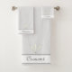 Elegant feathers on light silver grey and white Bath Towl Set. Crescent text can be personalised.