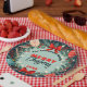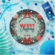 The plate's core features a cheerful "MERRY CHRISTMAS" greeting in a bold red block font and elegant script, set against a soft, muted aqua background. It's fully customisable with your family name curving above and a custom "20XX" date below. Four vintage-inspired Christmas ornaments in red, cream, and turquoise hang from the boughs with delicate ribbons, adding a sparkling touch. The entire design is expertly grounded by a deep navy outer rim, offering a sophisticated and stunning contrast to your holiday treats. Personalise this plate for a stylish and unforgettable holiday gathering.