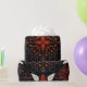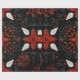 Intricate black background with a symmetrical floral pattern in red, white, and gold. Curved lines and dots add detail, creating an elegant, festive feel.