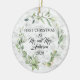 Elegant First Christmas Married Greenery on faux Marble background Ceramic Ornament celebrates the love that a couple shares on their first Christmas together and is truly magical. Set against and elegant marble look background, a wreath of watercolor greenery frames the announcement of "FIRST CHRISTMAS AS Mr. and Mrs and the last name..The front of the ornament is totally editable with the personalize option. Change the names, the year even the " first Christmas." And the back of the ornament features easy placement of a picture of the happy couple. Elegant First Christmas Married Greenery Marble Ceramic Ornament also makes a fun package topper and gift basket addition for the happy couple. Perfect as a gift for wedding showers, Christmas, anniversaries and more. You will find this rustic First Christmas ornament and many other styles in our "OUR FIRST CHRISTMAS" COLLECTION IN OUR STORE. If you need help, please contact me.