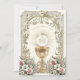 Celebrating the Sacrament of First Holy Communion is a wondrous occasion. This traditional Catholic custom-designed vintage First Holy Communion Invitation features a beautiful image of the Chalice and Host, the Eucharist overlaid on an ornate gold frame, accented with white lilies and pink roses. All text and fonts can be easily modified.
