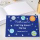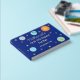 This small First Trip Around The Sun silver foil guest book and album in a dark blue variation is a cute addition to the sun, stars, and planets theme for a baby boy's 1st birthday. It coordinates with the other galaxy party decor, check out the full collection. This design features a hand-painted sun, stars, and watercolor planets on the front and reverse side.
