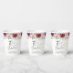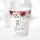 Elegant paper cups for her 70th birthday party featuring "70 & Fabulous" in a stylish script and watercolor bouquets of burgundy red, blush pink and purple florals with sage greenery.