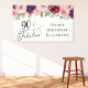 Elegant banner and welcome sign for her 90th birthday party with "90 & Fabulous" in a calligraphy script and watercolor bouquets of burgundy red, blush pink and purple florals with light sage greenery.