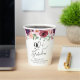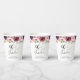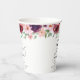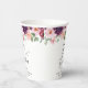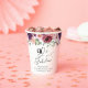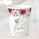 Elegant paper cups for her 90th birthday party with "90 & Fabulous" in a calligraphy script and watercolor bouquets of burgundy red, blush pink and purple florals with sage greenery.