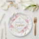 Modern elegant girl Baptism paper plates. Design features pink floral elements with gold glitter, gold faux foil cross and handwritten script ''Baptism'', personalize with a name,date.