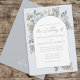 This design features a watercolor dusty blue floral rose elegant, with light blue flower, rose silver leaves, elegant floral classic blue silver, a classic formal romantic calligraphy, minimalist simple greenery monogram back, watercolor floral foliage leaves, eucalyptus leaves silver green, simple elegant calligraphy script, a classy modern minimal botanical garden, stylish trendy typography ampersand, traditional wedding classic light blue, beautiful pretty elegance simplistic