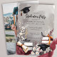 Celebrate the graduate's accomplishments with this elegant and timeless graduation party invitation. The design features classic imagery of graduation caps, books, and a diploma, combined with delicate floral accents for a touch of sophistication. This card is perfect for any degree. Add a favourite photo on the back to showcase the star of the show! Personalise it with event and graduate details.