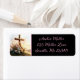This return address label features a serene and beautiful design. On the left side, there is an image of a wooden cross surrounded by a variety of blooming flowers, including daisies, set against a soft, pastel-coloured sky. The right side of the label has a black background with elegant, cursive pink text displaying the address details. The combination of the floral cross and the sophisticated text makes this label both visually appealing and meaningful.