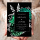 This elegant, moody wedding invitation features a lush, romantic floral bouquet in emerald green with silver faux foil and glitter foliage on a black background. Customise the gold-coloured text in stylish fonts on a black rectangle. The back of the card is solid black.