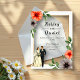 This elegant watercolor floral wedding acrylic invitation is perfect for a modern wedding. The romantic design features a sleek watercolor floral frame with a bride and groom illustration and black calligraphy on a white background.