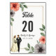 This elegant watercolor floral wedding table number is perfect for a modern wedding. The romantic design features an elegant watercolor floral frame with a bride and groom illustration and black calligraphy on a white background.