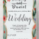 This elegant watercolor floral wedding invitation is perfect for a modern wedding. The romantic design features a sleek watercolor floral frame with a bride and groom illustration and black calligraphy on a white background.