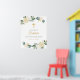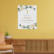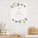 This stylish First Holy Communion welcome sign for a girl features elegant custom wording for your special event accented by a gold cross and framed by a beautiful floral watercolor wreath design with painted roses, ranunculus flowers, and greenery in neutral shades of white, cream, gold, rose gold, and green.