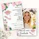 Create a unique floral white and pink graduation party invitation that features the graduate's photo template on the backside (makes it easy to upload your custom picture) and is decorated with pink roses illustrations in watercolor style and grad's cap and diploma graphics designed in rose gold colours. Type your text and upload a photo using the template before ordering.
