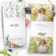 Lovely winter watercolor style floral border cluster featuring pink roses, pine cones, fir branches, holly & eucalyptus with elegant red Merry Christmas greeting in handwritten calligraphy font with flourishes, with text field for personalisation. Panels feature complementary eucalyptus pattern, photo templates and text fields.