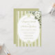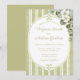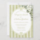 Imagine the beauty of your special day captured in an elegant invitation. This watercolor illustration features a soft, striped green background, creating a calming and fresh ambiance. At the center, a delicate white oval frame provides the perfect space for your wedding details, while the top right corner is adorned with beautiful white flowers and graceful eucalyptus leaves. The design embodies a natural, serene vibe, with a focus on organic beauty and subtle elegance. Perfect for a couple looking for a sophisticated, nature-inspired touch to announce their love.