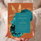 This elegant wedding invitation features a lush, romantic floral bouquet in teal blue with gold faux foil and glitter foliage on a burnt orange background. Customise the gold-coloured text in stylish fonts on a teal blue rectangle. The back of the card is solid burnt orange.