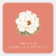 This is a minimalist style image featuring a delicate white peony with lush green leaves set against a warm coral background. The soft, inviting colors and the graceful composition evoke feelings of gratitude and appreciation. It's perfect for expressing heartfelt thanks in a sophisticated manner, making it ideal for special occasions like weddings or anniversaries.