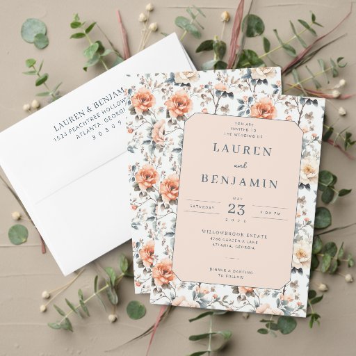 This is a floral style image featuring delicate, pastel-coloured roses and foliage in soft shades of pink, peach, and cream. The composition centres around an elegant card with rounded corners, set against a beautifully detailed background that exudes romance and sophistication. It's perfect for guiding wedding guests to more information about the event, inviting them into a world of gentle beauty and anticipation.