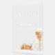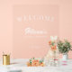 Modern elegant gold cream wedding gown with peach beige watercolor flower bouquets bridal shower transparent acrylic welcome sign with a chic typography script.