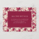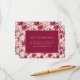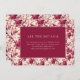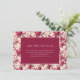 This is a vintage style image featuring an elegant floral pattern in rich red and cream colors. The intricate design of roses and birds creates a romantic and sophisticated atmosphere, perfect for wedding invitations or announcements. The central maroon rectangle with white text invites guests to explore more details on the couple's website, adding a touch of modernity to the classic theme. It exudes warmth and charm, making it ideal for setting the tone for a beautiful celebration.