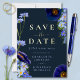 Beautiful spring and summer floral watercolor wildflowers and foliage in blush blue, dusty blue, cornflower blue, navy blue, purple and green hues. Elegant modern typography script in gold foil and blush blue complements the stylish hand painted artwork which includes cornflowers, poppy, cosmos, forget me nots and delicate foliage. Save the date perfect for a spring meadow, summer garden wedding. Original artwork by artist Catherine Sweetman