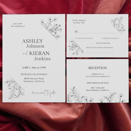 Elegant Floral wedding invitation enclosure card featuring playful sprigs of wildflowers in the top corners displaying your event details in rich and refined fonts against a dark grey background. Your monogram initial on the backside.