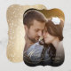 This stylish and classy holiday/christmas wedding announcement / first christmas card features the word 'Merrily Ever After' in a mix of elegant flourish script calligraphy and classic serif text in faux gold foil overlaying a full bleed photo.