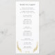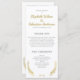 Elegant wedding program with a script text in golden yellow and black modern font text on white background. The program is decorated with a gold flourish ornament. Personalise this template with your data.