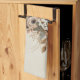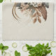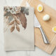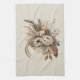 A kitchen towel with a pretty bouquet of peach florals, surrounded by brownish bronze grasses and foliage with feather accents.
