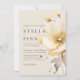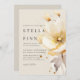 Elegant and romantic watercolor one large flower white yellow and gold on sand wedding invitation with QR code for RSVP and wedding details.
