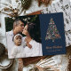 This beautiful photo holiday card features a Christmas tree designed out of winter foliage, berries, and a cute little deer. Stylish real foil text and accents add an elegant touch. The background colors can be easily customized, if desired. The back contains matching navy blue diagonal stripes.