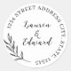 Custom-designed wedding round address stickers for wedding envelopes and save the dates featuring rustic elegant foliage design with custom name and address.